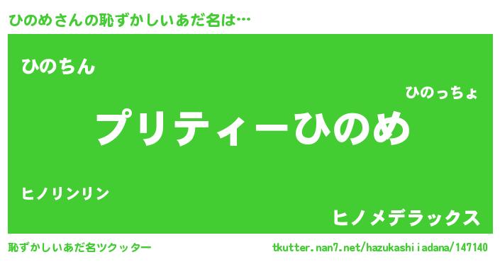 | 男性向けラノベタイトル風あだ名 | 『ひのめに滅ぼされるだけの簡単なお仕事です』 |