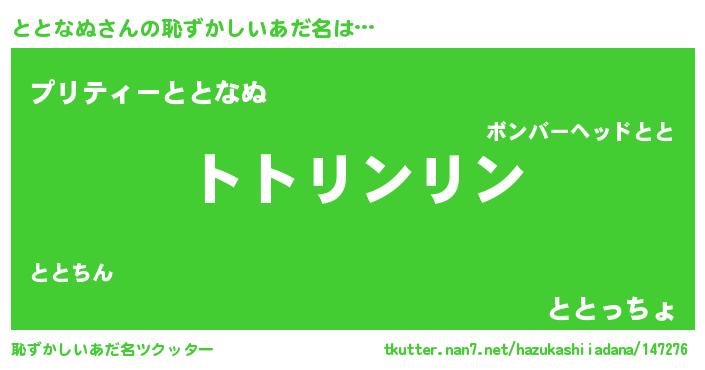 | 男性向けラノベタイトル風あだ名 | 『ととなぬの嫁は女の子じゃないと思った?』 |