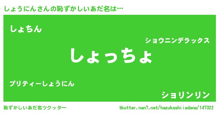 しょうにんさんの恥ずかしいあだ名は… 『しょっちょ』『しょちん』『ショリンリン』 ツクッター #恥ずかしいあだ名ツクッター http://tkutter.nan7.net/hazukashiiadana/147322/