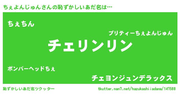 | 男性向けラノベタイトル風あだ名 | 『ちぇよんじゅんの嫁は女の子じゃないと思った?』 |