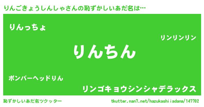 | 男性向けラノベタイトル風あだ名 | 『この素晴らしい世界にりんごきょうしんしゃを!』 |