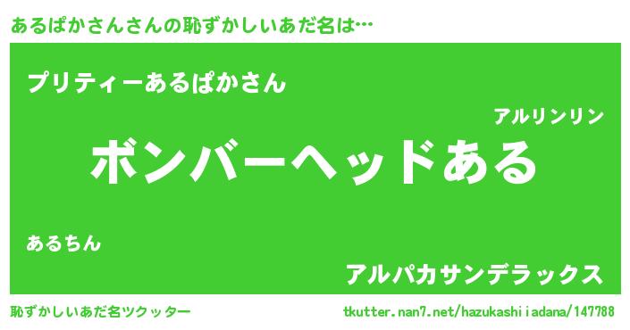 | 男性向けラノベタイトル風あだ名 | 『おまえをオタクにしてやるから、俺をあるぱかさんにしてくれ! 』 |