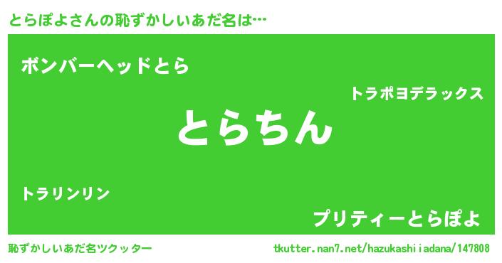 | ヘコむあだ名 | 『とらぽよ(笑)』『とらもー』 |