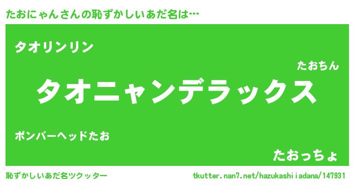 たおにゃんさんの恥ずかしいあだ名は… 『タオニャンデラックス』『タオリンリン』『たおっちょ』 ツクッター #恥ずかしいあだ名ツクッター http://tkutter.nan7.net/hazukashiiadana/147931/