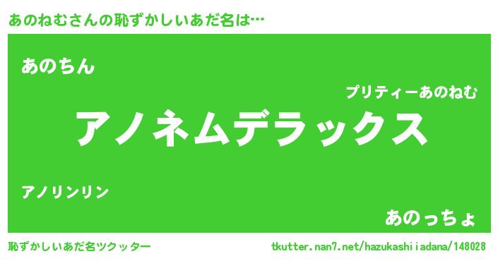 | 男性向けラノベタイトル風あだ名 | 『Re:あのねむから始める異世界生活』 |