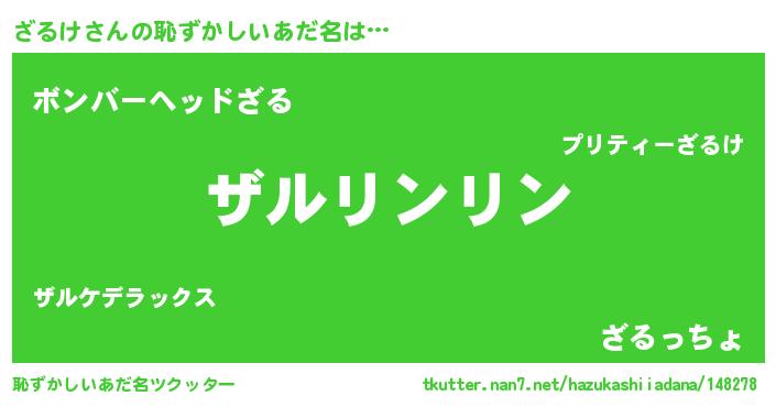 ざるけさんの恥ずかしいあだ名は… 『ザルリンリン』『ボンバーヘッドざる』『ざるっちょ』 ツクッター #恥ずかしいあだ名ツクッター http://tkutter.nan7.net/hazukashiiadana/148278/