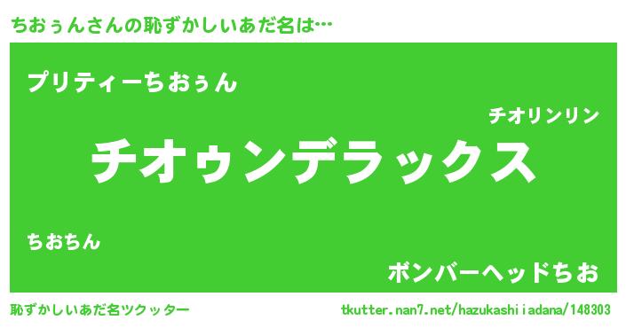 | 男性向けラノベタイトル風あだ名 | 『Re:ちおぅんから始める異世界生活』 |