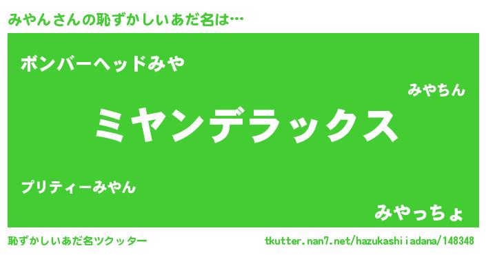 | ヘコむあだ名 | 『レバニラ』『みやん(笑)』『みやお』 |