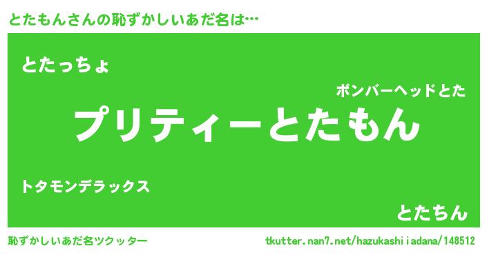 | 男性向けラノベタイトル風あだ名 | 『とたもんに滅ぼされるだけの簡単なお仕事です』 |