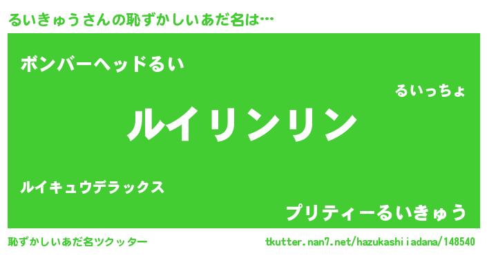 | 男性向けラノベタイトル風あだ名 | 『るいきゅうの嫁は女の子じゃないと思った?』 |