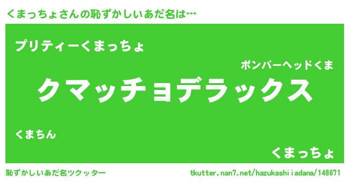 | 男性向けラノベタイトル風あだ名 | 『Re:くまっちょから始める異世界生活』 |