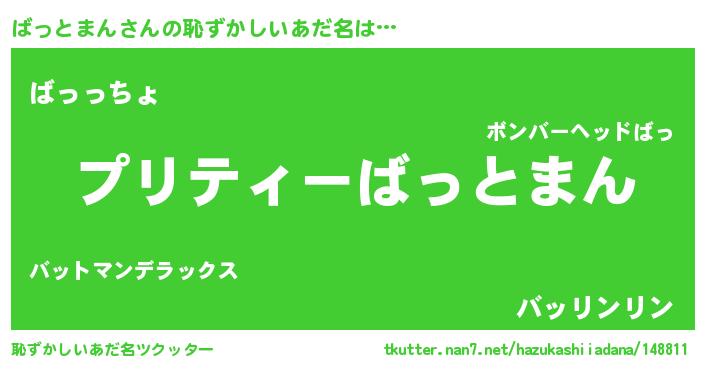 ばっとまんさんの恥ずかしいあだ名は… 『プリティーばっとまん』『ばっっちょ』『バッリンリン』 ツクッター #恥ずかしいあだ名ツクッター http://tkutter.nan7.net/hazukashiiadana/148811/