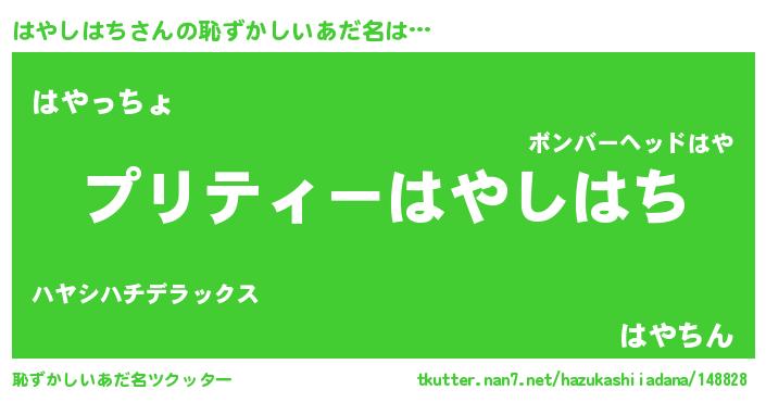 | 男性向けラノベタイトル風あだ名 | 『この素晴らしい世界にはやしはちを!』 |