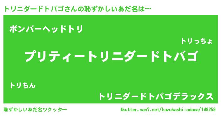 | 男性向けラノベタイトル風あだ名 | 『トリニダードトバゴに滅ぼされるだけの簡単なお仕事です』 |