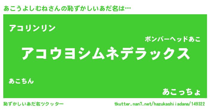 | 意味不明あだ名 | 『自称あこうよしむね』 |