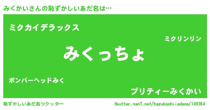 | 女子向けラノベタイトル風あだ名 | 『みくかいの雑貨屋さん』『闇のみくかい』 |
