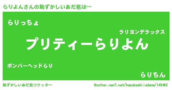 | 男性向けラノベタイトル風あだ名 | 『ラリヨンスレイヤー』『らりよんの憂鬱』 |