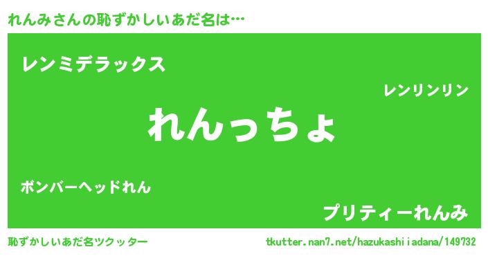 れんみさんの恥ずかしいあだ名は… 『れんっちょ』『レンミデラックス』『プリティーれんみ』 ツクッター #恥ずかしいあだ名ツクッター http://tkutter.nan7.net/hazukashiiadana/149732/
