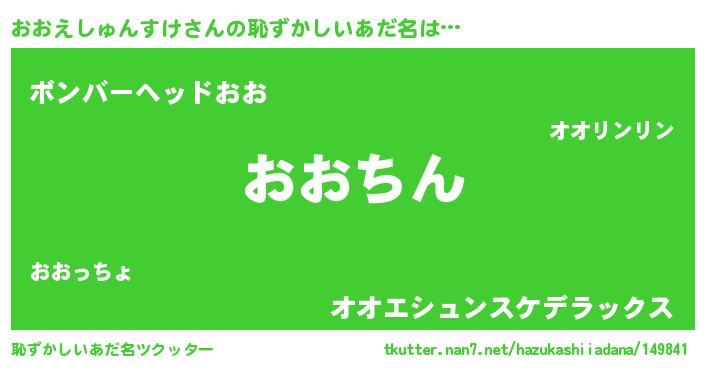 おおえしゅんすけさんの恥ずかしいあだ名は… 『おおちん』『ボンバーヘッドおお』『オオエシュンスケデラックス』 ツクッター #恥ずかしいあだ名ツクッター http://tkutter.nan7.net/hazukashiiadana/149841/