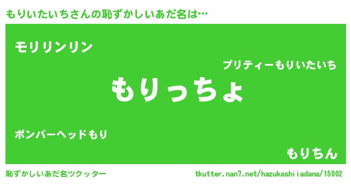 | 男性向けラノベタイトル風あだ名 | 『もりいたいち~年齢イコール彼女いない歴の魔法使い~』 |