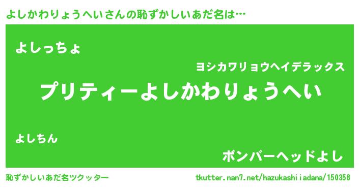 | 男性向けラノベタイトル風あだ名 | 『この素晴らしい世界によしかわりょうへいを!』 |
