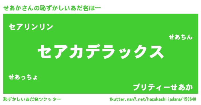 | 男性向けラノベタイトル風あだ名 | 『はたらくせあかさま!』『せあかの憂鬱』 |