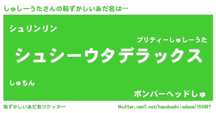 しゅしーうたさんの恥ずかしいあだ名は… 『シュシーウタデラックス』『シュリンリン』『ボンバーヘッドしゅ』 ツクッター #恥ずかしいあだ名ツクッター http://tkutter.nan7.net/hazukashiiadana/150967/