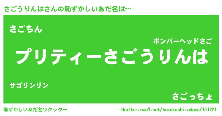 さごうりんはさんの恥ずかしいあだ名は… 『プリティーさごうりんは』『さごちん』『さごっちょ』 ツクッター #恥ずかしいあだ名ツクッター http://tkutter.nan7.net/hazukashiiadana/151221/