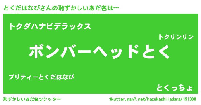 | 女子向けラノベタイトル風あだ名 | 『とくだはなびの玉の輿計画!』 |