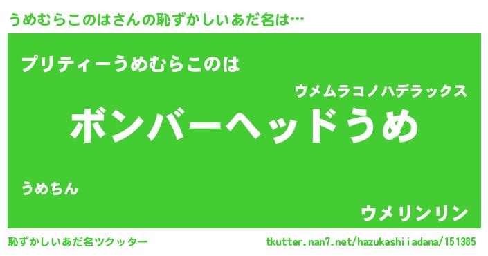 | 男性向けラノベタイトル風あだ名 | 『この素晴らしい世界にうめむらこのはを!』 |