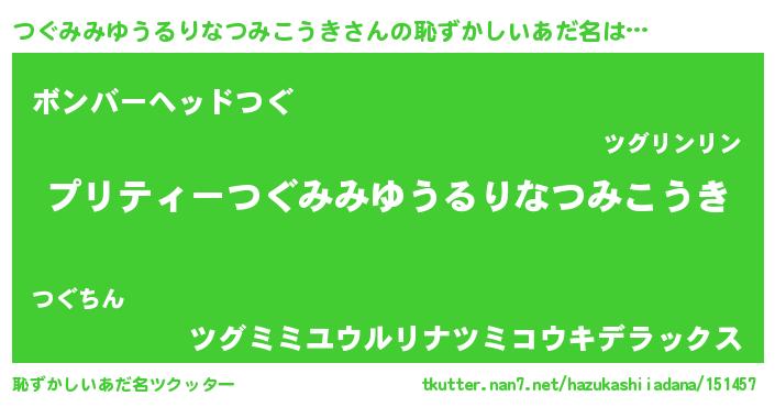 | ヒーロー風カッコイイあだ名 | 『スーパーツグミミユウルリナツミコウキ』 |
