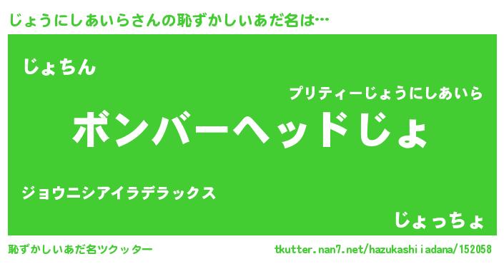| ヘコむあだ名 | 『じょうにしあいら(遠い目)』『豆乳』 |