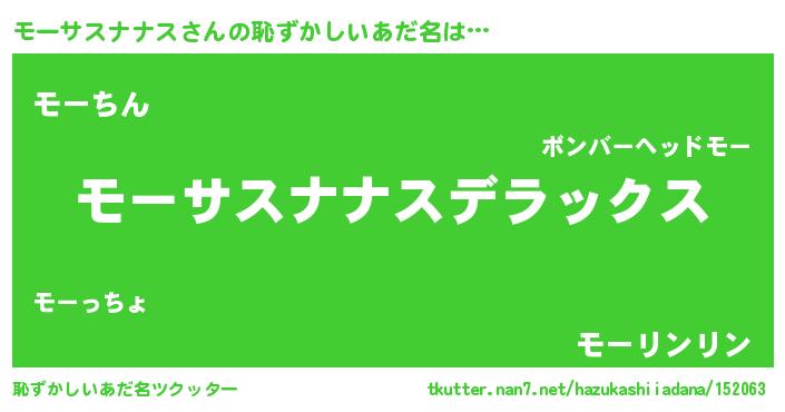 | 男性向けラノベタイトル風あだ名 | 『Re:モーサスナナスから始める異世界生活』 |