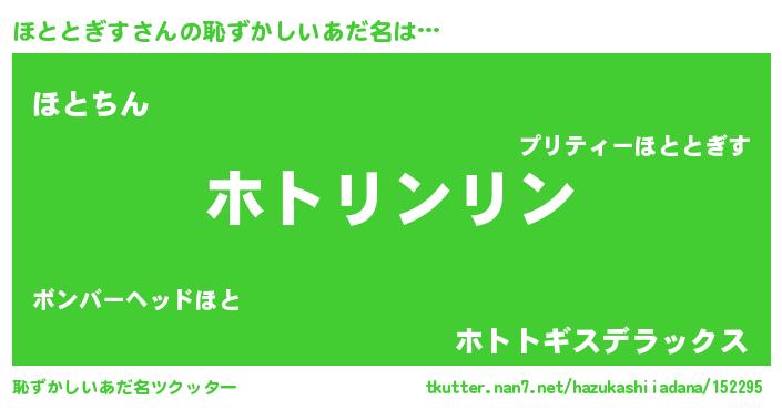| 女子向けラノベタイトル風あだ名 | 『乙女ゲームの破滅フラグしかない悪役ほととぎすに転生してしまった…』 |