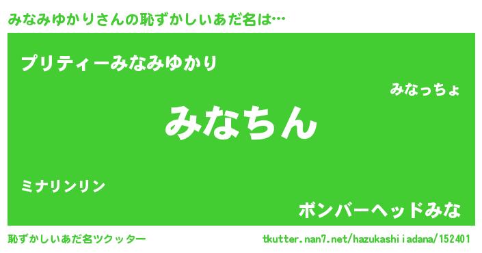 | 男性向けラノベタイトル風あだ名 | 『みなみゆかり~年齢イコール彼女いない歴の魔法使い~』 |