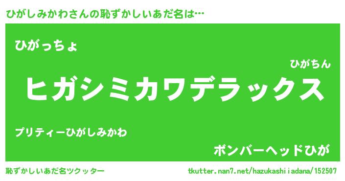 | 男性向けラノベタイトル風あだ名 | 『Re:ひがしみかわから始める異世界生活』 |