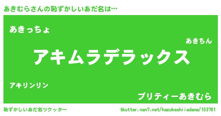 | 意味不明あだ名 | 『自称あきむら』『しいたけ科あきむら属』 |