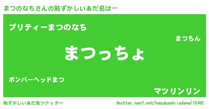 | 男性向けラノベタイトル風あだ名 | 『まつのなち~年齢イコール彼女いない歴の魔法使い~』 |