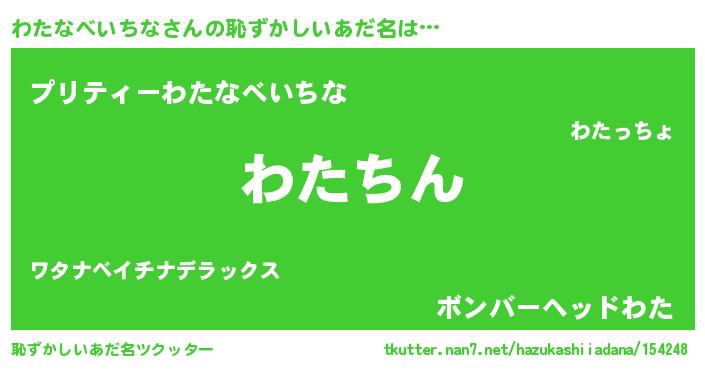| ヘコむあだ名 | 『わたなべいちな(爆)』『わたふぇ~』 |