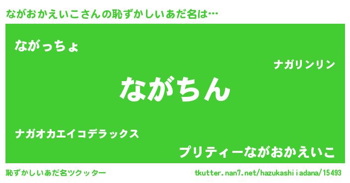 ながおかえいこさんの恥ずかしいあだ名は… 『ながちん』『ながっちょ』『プリティーながおかえいこ』 ツクッター #恥ずかしいあだ名ツクッター http://tkutter.nan7.net/hazukashiiadana/15493/
