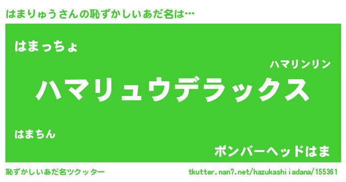| 男性向けラノベタイトル風あだ名 | 『Re:はまりゅうから始める異世界生活』 |