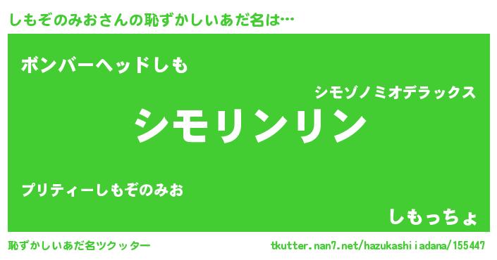 | 意味不明あだ名 | 『とにかく怪しいしもぞのみお』 |