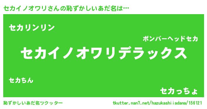 | ポケモン風あだ名 | 『セカセウス』『ヒセカイノオワリ』 |