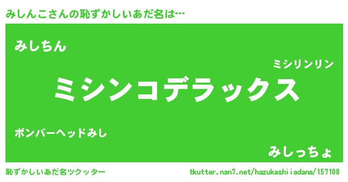 | 意味不明あだ名 | 『自称みしんこ』『永久保存みしんこ』 |
