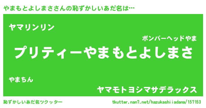 | 男性向けラノベタイトル風あだ名 | 『やまもとよしまさ~年齢イコール彼女いない歴の魔法使い~』 |