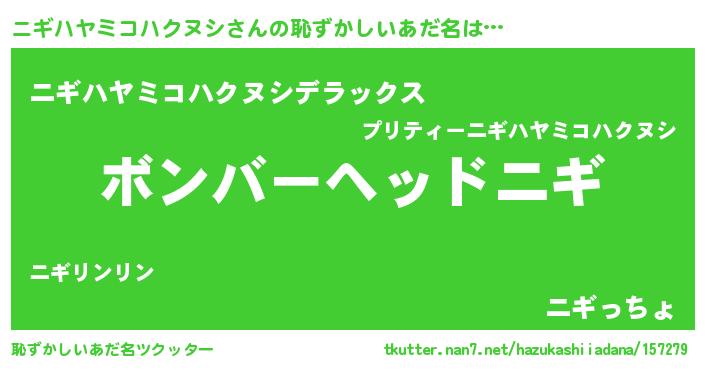 | 欧米人風あだ名 | 『ダレノガレニギハヤミコハクヌシ』 |