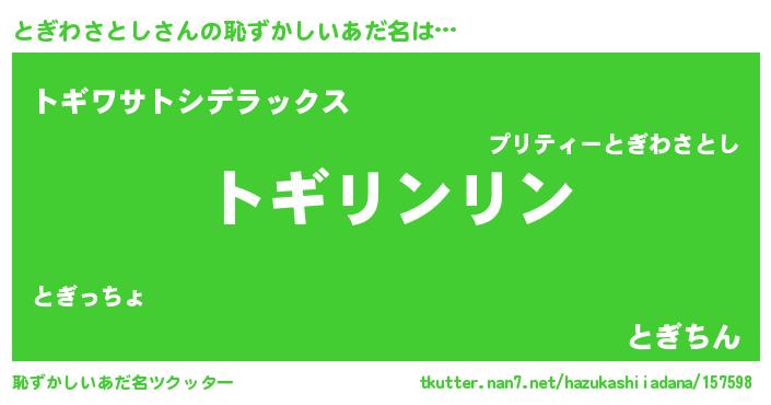 | ヒーロー風カッコイイあだ名 | 『魔戒騎士トギ』『究極戦士トギワサトシ』 |