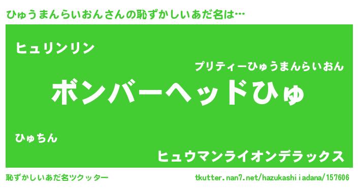 | 男性向けラノベタイトル風あだ名 | 『ノーゲーム・ノーヒュウマンライオン』 |