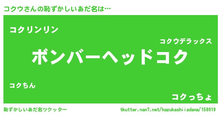 | ヒーロー風カッコイイあだ名 | 『慈愛の使者コクウ』『炎刃騎士コク』 |