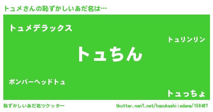 | ヘコむあだ名 | 『トュメ(小並感)』『酢こんぶ』 |